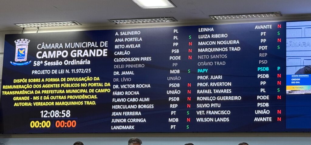 Durante a sessão ordinária da Câmara Municipal de Campo Grande, o vereador Marquinhos Trad defendeu na tribuna seu Projeto de Lei nº 11.972/2025, que buscava ampliar a transparência na divulgação das informações da folha de pagamento da Prefeitura Municipal. Apesar do mérito técnico e jurídico reconhecido nas comissões da Casa, o projeto não foi aprovado pela maioria dos vereadores.